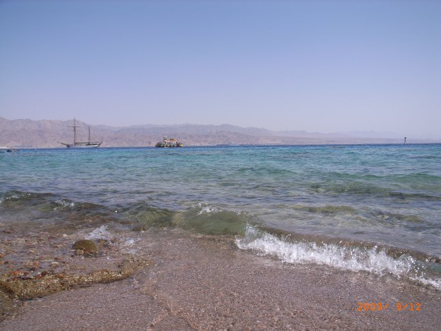 波は海と違って大きくありません。丁度、湖と同じ感じです。対岸はイスラエルです。