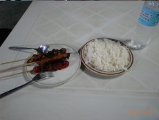 ◇夕食をPierl1埠頭の前の食堂でいただきました。チキンの串刺し、魚の串刺し、チマキみたいなご飯で チマキみたいなご飯は固くてマズイ!ソースを付けてスパイシーにして食べます。 145ペソ(約320円) 「お店」 |