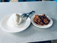 ◇昼食は鶏肉の煮物とご飯。食べれれ良し程度。オバチャンが楽しい田舎の超ローカル食堂 70ペソ |