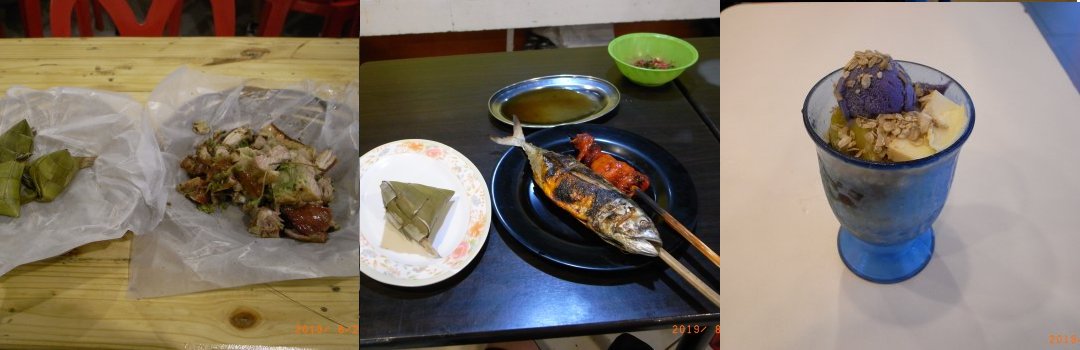 ・チキンとチマキ御飯2個。フィリピンで初めての夕食。竹の皮で包まれた三角形の日本のチマキとそっくりのご飯。 ただし、硬いご飯。竹串で刺したチキンを炭火で焼きなおして温かくしたのでウマイ。。