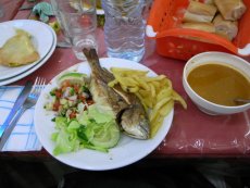 ![]() ◇チュニスで初めての夕食 「モハメド・アビド・パスタカサ」 でいただきました。 「魚と野菜とポテトの盛り合わせ」9D スープとブリックが付いて全部で11D(約640円) もちろんフランスパンは付いています 「モハメド・アビド・パスタカサ店内」 |