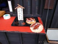 古い町並みに「飛騨牛握り寿し」の看板。2貫で500円!一口で美味しくいただきました。